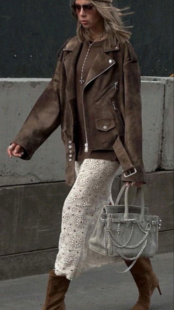 Y para acabar este look en tonalidades marrones (uno de los colores top de esta temporada) con diferentes texturas consta el 70% y el 30% restante lo completan esa prenda especial como es la falda midi de encaje, un bolso con cadenas, un colgante con una cruz y unas gafas en los mismos tonos que el look.