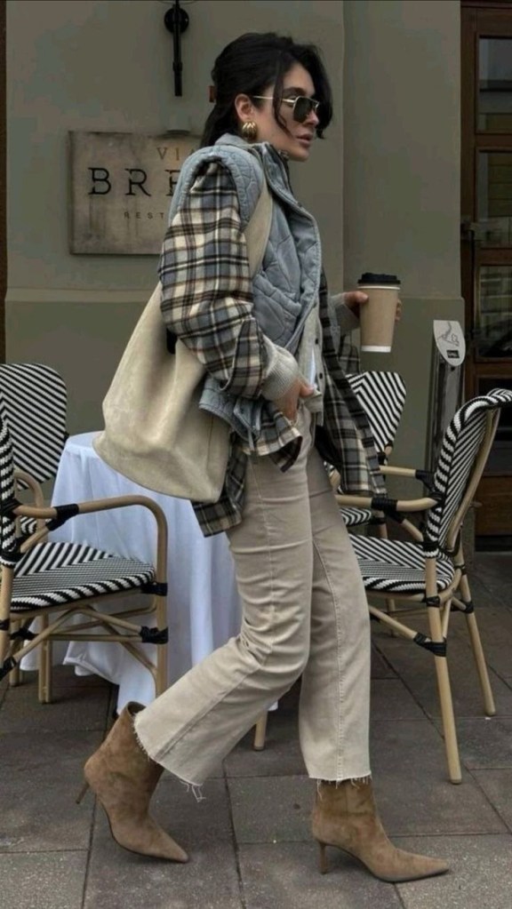 Un 70% del look consta de prendas básicas en colores neutros y tejidos naturales como el ante. Complementando el look con un chaleco denim, gafas de sol y pendientes en tendencia y añade el toque con una pinza en el pelo. Ahí tienes el 30% que hace que este look sea increíble ¿No crees?