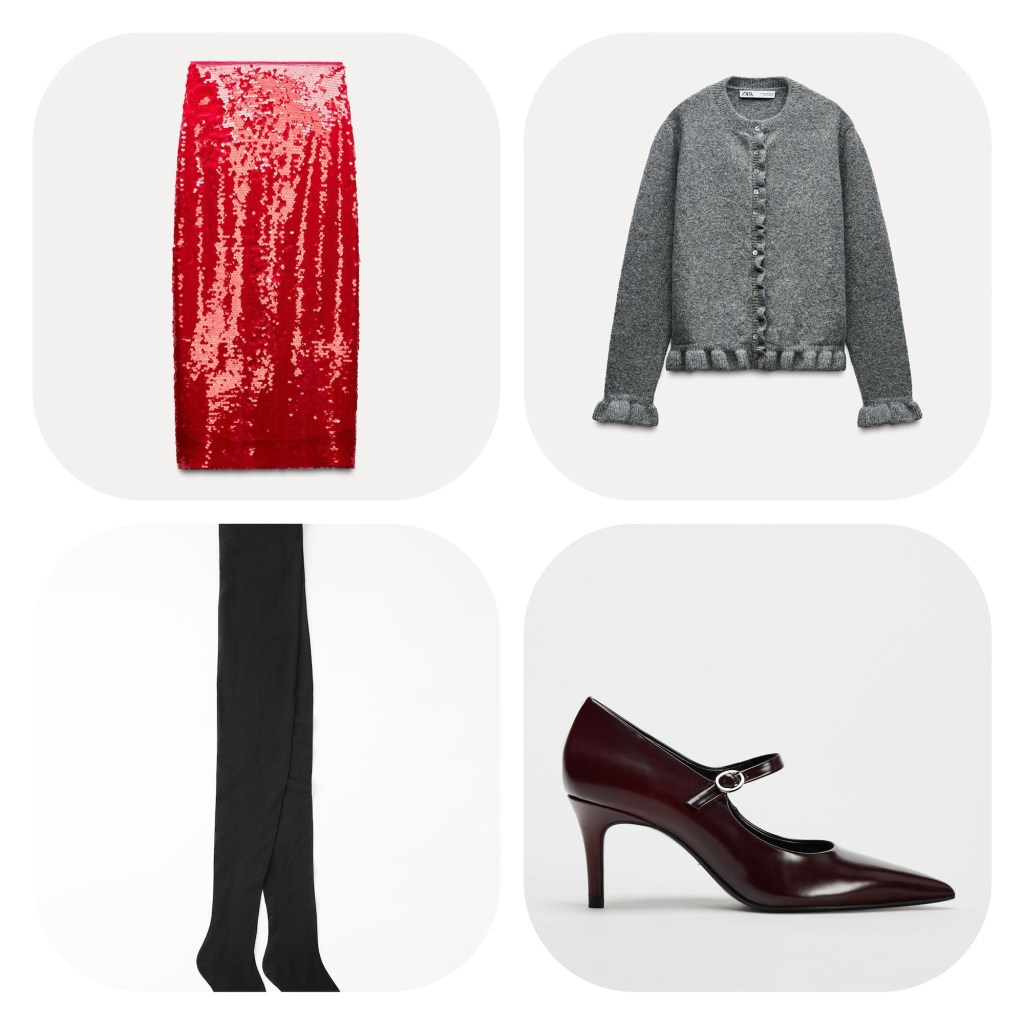Usar una prenda con el color de las fiestas y encima de lentejuelas se lleva todo el protagonismo del look por eso las demás prendas tienen que suavizar el look y complementar esa prenda tan llamativa. Yo he elegido una chaqueta en color gris, pero puedes usar un body, una blusa u otra prenda en tonos básicos y lisos para no robarle el protagonismo a la falda. Unas medias y unas mary jane o botas, le irían ideal.