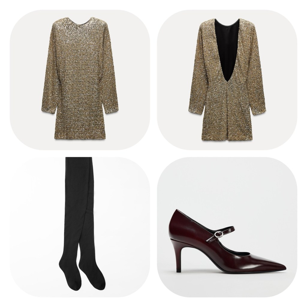 Este primer look consta de un vestido mini muy fiestero con lentejuelas en tonos dorados (ten en cuenta que si eres piel fría NO te va a favorecer este color metalizado) con un escote muy sensual en la espalda, unas medias negras y como no podría faltar unas mary jane en el color de la temporada, este estilo de zapatos son tendencia este año.